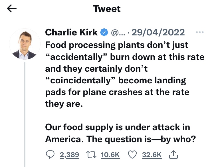 1 ➖4/30/21 Monmouth Smithfield Foods pork processing plant 2 ➖7/25/21 Memphis Kellogg plant 3 ➖8/13/21 JBS beef plant 4 ➖8/24/21 Patak Meat Company 5 ➖7/30/21 Tyson River Valley ingredient plant 6 ➖10/21/21 Darigold plant 7 ➖11/15/21 Garrard County food plant 8➖11/29/21 Maid-Rite Steak Company 9➖12/13/21 San Antonio food processing, West side Foods 10➖1/7/22 Hamilton Mountain poultry processing Plant 11➖1/13/22 Cargill-Nutrene feed mill. Lacombe, La 12➖1/31/22 Winston-Salem fertilizer plant 13➖2/3/22 Wisconsin River Meats 14➖2/3/22 Percy dairy farm 15➖2/5/22 Wisconsin River Meats processing facility destroyed by fire in Mauston, Wisconsin. 16➖2/15/22 Bonanza Meat Company goes up in flames in El Paso, Texas 17➖2/15/22 Shearer’s Foods Food processing plant explodes in Hermiston, Oregon. 18➖2/16/22 Indiana Louis-Dreyfus soy processing plant 19➖2/18/22 Bess View Farms 20➖2/19/22 Lincoln premiere poultry 21➖2/22/22 Shearer’s Foods potato chip plant 22➖2/22/22 Fire destroys Deli Star Meat Plant in Fayetteville, Illinois. 23➖2/28/22 nutrient AG Solutions fertilizer facility burns 24➖2/28/22 Shadow Brook Farm & Dutch girl Creamery burns 25➖3/4/22 294,800 chickens destroyed at farm in Stoddard, Missouri 26➖3/4/22 644,000 chickens destroyed at egg farm in Cecil, Maryland 27➖3/8/22 243,900 chickens destroyed at egg farm in New Castle, Delaware 28➖3/10/22 663,400 chickens destroyed at egg farm in Cecil, MD 29➖3/10/22 915,900 chickens destroyed at egg farm in Taylor, IA 30➖3/14/22 Wayne Hoover dairy farm, barn full of vows burns 31➖3/14/22 2,750,700 chickens destroyed at egg farm in Jefferson, Wisconsin 32➖3/16/22 Walmart Distribution Center burns for 76 hours in Plainfield Ind. 33➖3/16/22 Nestle Food Plant extensively damaged in fire and new production destroyed Jonesboro, Arkansas 34➖3/17/22 5,347,500 chickens destroyed at egg farm in Buena Vista, Iowa 35➖3/17/22 147,600 chickens destroyed at farm in Kent, Delaware 36➖3/18/22 315,400 chickens destroyed at egg farm in Cecil, Maryland 37➖3/19/22 Walmart Food Distribution center catches fire in Plainfield, Indiana 38➖3/22/22 172,000 Turkeys destroyed on farms in South Dakota 39➖3/22/22 570,000 chickens destroyed at farm in Butler, Nebraska 40➖3/24/22 Major Fire at McCrum Potato Plant in Belfast, Maine. 41➖3/24/22 418,500 chickens destroyed at farm in Butler, Nebraska 42➖3/25/22 250,300 chickens destroyed at egg farm in Franklin, Iowa 43➖3/26/22 311,000 Turkeys destroyed in Minnesota 44➖3/27/22 126,300 Turkeys destroyed in South Dakota 45➖3/28/22 1,460,000 chickens destroyed at egg farm in Guthrie, Iowa 46➖3/29/22 Maricopa, Az. Food Pantry burns down 50,000 pounds of Food destroyed in Maricopa, Arizona. 47➖3/31/22 Rio Fresh Onion factory damaged by fire in San Juan, Texas. 48➖3/31/22 76,400 Turkeys destroyed in Osceola, Iowa 49➖3/31/22 5,011,700 chickens destroyed at egg farm in Osceola, Iowa 50➖4/6/22 281,600 chickens destroyed at farm in Wayne, North Carolina 51➖4/9/22 76,400 Turkeys destroyed in Minnesota 52➖4/9/22 208,900 Turkeys destroyed in Minnesota 53➖4/12/22 89,700 chickens destroyed at farm in Wayne, North Carolina 54➖4/12/22 1,746,900 chickens destroyed at egg farm in Dixon, Nebraska 55➖4/12/22 259,000 chickens destroyed at farm in Minnesota 56➖4/13/22 Fire destroys East Conway Beef & Pork Meat Market in Conway, New Hampshire. 57➖4/13/22 Plane crashes into Gem State Processing, Idaho potato and food processing plant 58➖4/13/22 77,000 Turkeys destroyed in Minnesota 59➖4/14/22 Taylor Farms Food Processing plant burns down Salinas, California. 60➖4/14/22 Salinas food processing plant 61➖4/14/22 99,600 Turkeys destroyed in Minnesota 62➖4/15/22 1,380,500 chickens destroyed at egg farm in Lancaster, Minnesota 63➖ 4/19/22 Azure Standard nation’s premier independent distributor of organic and healthy food, was destroyed by fire in Dufur, Oregon 64➖4/19/22 339,000 Turkeys destroyed in Minnesota 65➖4/19/22 58,000 chickens destroyed at farm in Montrose, Colorado